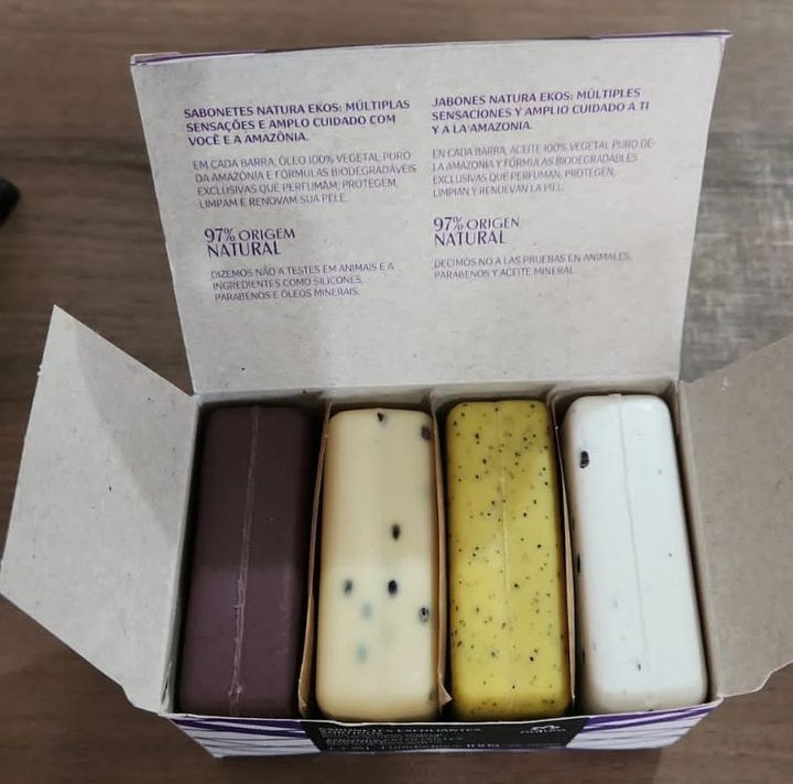 Caja con 4 jabones exfoliantes de la Línea Ekos. Vienen con semillitas naturales y están elaborados con aceites 100% vegetales de la Amazonia y enriquecidos con óleos y mantecas naturales. Su perfume es exquisito! Un mimo para el baño. Aromas: